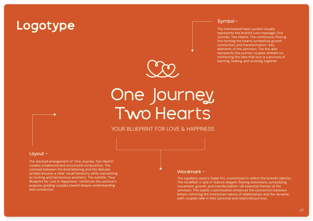The One Journey Two Hearts branding merges clean, modern typography with expressive, fluid elements, creating an identity that feels structured yet emotional, professional yet deeply personal. From seminar presentations to printed materials, the branding ensures that couples feel welcomed, supported, and empowered in their journey toward a stronger relationship.